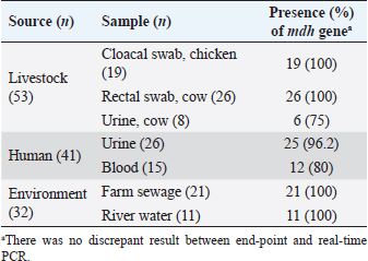 AbstractBackground: Escherichia coli cause a wide range of infections in humans and animals in hospitals and community associated with multidrug-resistance, and serves as a bioindicator of fecal contamination as well as antimicrobial resistance (AMR). Aim: Early detection of this bioindicator from humans, animals, and environment facilitates characterization with respect to AMR and bacterial forensics for effective public health and infection control measurements. Method: We investigated a simple and rapid species-specific end-point and real-time PCR assays targeting malate dehydrogenase (mdh) gene to detect E. coli isolated from livestock, human, and environmental water in Midnapore, West Bengal, India, in a timely and cost-effective approach. Results: Of 126 E. coli isolates, 53, 41, and 32 were cultured from livestock, human, and environmental water. The mdh gene was present in 120 (95.2%) isolates, including all environmental isolates. Two (3.8%) animal and four human (9.8%) isolates were discordant between culture and PCR results. The PCR assays produced results in about 90 minutes with a running cost of US$3-5 per sample. Conclusion: Both the PCR assays may be utilized in detection of E. coli depending on the laboratory infrastructure. Keywords: Escherichia coli, Bioindicator, PCR, mdh. IntroductionEscherichia coli (E. coli), which belongs to the family Enterobacterales, is of high public health concern due to worldwide increases in antimicrobial resistance (AMR) (Anjum et al., 2021). Escherichia coli is the common gut microbiota of humans and warm-blooded animals, as well as anthropogenic-mediated environmental contaminants that serve as a bioindicator of circulating AMR due to their early adaptation to antibiotic resistance genes (Anjum et al., 2021). This pathogen is frequently associated with community and hospital outbreaks leading to case fatalities (Poirel et al., 2018). The World Health Organization recognized critical priority E. coli as one health challenge (Fuga et al., 2022). Molecular techniques depreciate the traditional microbiological methods in microbial identification with respect to time and cost (Tran et al., 2015). End-point and real-time PCRs are commonly used as molecular biology tools, depending on the infrastructure and equipment facilities of the laboratory (Tarr et al., 2002; Molina et al., 2015). Here, we standardized the molecular detection of E. coli, collected from different sources targeting a housekeeping gene, malate dehydrogenase (mdh) by end-point and real-time PCRs at a low cost and in a short time for easier implementation. Material and MethodsThe prospective study was conducted in the Department of Biomedical Laboratory Science and Management at Vidyasagar University, Midnapore, West Bengal, India. Escherichia coli isolates (n=126) used in this study were collected from livestock, human, and environmental water in Midnapore district from August 2021 to March 2022. Rectal swabs of livestock were transported in Carry-Blair medium and enriched in 10 ml brain-heart infusion (BHI) broth (BD, Sparks, MD) followed by sub-cultured on eosin-methylene blue (EMB) agar. Sewage and river water samples were collected in sterile 500 ml containers and filtered through 0.45 µm pore membranes (50 ml) using filtration assembly followed by inoculation on EMB agar plates. The EMB agar-derived metallic-sheen colonies were considered for suspected E. coli isolates following confirmation by standard biochemical tests. Clinical E. coli isolates were collected from a healthcare in Midnapore, West Bengal. The isolates were preserved in BD with 15% glycerol (v/v) at −70°C. The biochemical-confirmed isolates were screened for the presence of the mdh gene by end-point and real-time PCRs using published primers (forward: 5’-GGTATGGATCGTTCCGACCT-3’; reverse: 5’-GGCAGAATGGTAACACCAGAGT-3’; amplicon size: 304 bp) with modification (Tarr et al., 2002). Quality control was assessed using the strains E. coli ATCC 25922, Klebsiella pneumoniae ATCC700603, Pseudomonas aeruginosa ATCC 27853, and Staphylococcus aureus ATCC 25923. The boiled DNA templates were prepared by dissolving a single colony in 200 μl of distilled water, lysing the bacteria at 95°C for 10 minutes, and collecting the supernatant following centrifugation. The 15 µl amplification mixture was prepared for end-point or real-time PCR using 7.5 µl of 2XTaq Mix (SRL, India) or RealQ Plus 2X Master Mix Green (AMPLIQON, Denmark), 0.15 µl of 20 µM of each primer, 2 µl of template DNA, and 5.2 µl of molecular-grade water. End-point PCR was performed on a Bio-Rad T100 thermocycler (Bio-Rad, US) at 95°C for 3 minutes, followed by 30 cycles of 30 seconds denaturation at 95°C, 30 seconds annealing at 60°C, 30 seconds extension at 72°C and a final extension step at 72°C for 5 minutes. PCR amplicons were analyzed on pre-EtBr stained 2% agarose gels at 100 V for 20 minutes and visualized using the Gel-Doc system (Bio-Rad). PCR products were purified using for Sanger sequencing. Real-time PCR was carried out on a StepOnePlus system (ThermoFisher Scientific, CA, USA) with a two-step program at 95°C for 15 minutes, followed by 40 cycles of denaturation at 95°C for 20 seconds, and annealing-extension at 60°C for 60 seconds. The melt curve analysis was performed for 15 seconds at 95°C, 60 seconds at 60°C, and 15 seconds at 95°C (ramp rate of 0.3°C/second and step and hold acquisition). The StepOnePlus software ver. 2.3 was used for the analysis of real-time PCR data. A cut-off cycle threshold (Ct) value ≤35 was considered a positive result. ResultsOf 126 E. coli isolates, livestock isolates (n=53) were cultured from chicken cloacal swabs (n=19), cow rectal swabs (n=26), and urine (n=8). Human isolates (n=41) were isolated from urine (n=26) and blood (n=15) samples (Table 1). Environmental isolates (n =32) were derived from farm sewage (n=21) and Kasai river water (n=11). Amplification with the primer pa