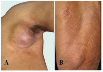 Fig. 1. Non-tender fluctuant axillary mass measuring 4 cm by 4 cm (A), 2 cm by 4 cm nontender, fluctuant mass over the lower back area (B).