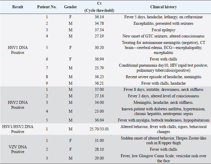 Examining a study by Babaei et al. (2021) on 200 CSF samples, which found 11.11% HSV-positive cases with a majority being older than 50, our study demonstrated a lower relative percentage of HSV detection (0.83%). This may imply regional variations in herpesvirus prevalence. Notably, VZV was associated with encephalitis in 0.17% of our suspected patients, emphasizing its role even in the absence of cutaneous manifestations. The observed disparity in viral etiologies, with HSV-1 being more prevalent in our study despite global reports favoring HSV-2 or VZV, may stem from environmental differences, cultural variances, or genetic susceptibility across populations. While Behzad-Behbahani et al. (2003) and Ziyaeyan et al. (2011) found no significant association between age, gender, and positive PCR results, our study deviates slightly. Although no substantial link was established between increasing age and positive results, a noteworthy connection emerged between HSV positivity and gender. Specifically, the gender distribution of HSV-positive cases was skewed toward males (15 males to 3 females), potentially influenced by our study’s male-heavy participant pool (1,003 males to 798 females). Despite strengths such as a substantial participant count from diverse sources across Sri Lanka, our study has limitations inherent to its retrospective nature. Some participants lacked data for CSF evaluations and clinical characteristics, limiting in-depth analysis. However, the study underscores the importance of herpesviruses as causative agents in CNS infectious diseases, necessitating further prospective research to delineate clinical characteristics and consequences of alpha herpes virus infections. ConclusionIn conclusion, this retrospective study sheds light on the detection of HSV-1, HSV-2, and VZV in CSF samples from suspected encephalitis patients in Sri Lanka. The findings emphasize the importance of real-time PCR in identifying causative agents in HE and contribute to our understanding of the clinical and demographic characteristics of herpesvirus infections. The study calls for further research with larger sample sizes to validate and expand upon these findings, providing a more comprehensive picture of herpesvirus-related encephalitis in the Sri Lankan context. AcknowledgmentThe authors express their gratitude to all the staff of the Department of Virology, Medical Research Institute, Sri Lanka. Conflict of interestThe authors declare that they have no competing interests. FundingThis research did not receive any specific grant from funding agencies in the public, commercial, or not-for-profit sectors. Authors contributionsStudy concept and design: JIA, HBCH; data analysis: HBCH, JIA, DVRGR, JMM, GDDC; Manuscript writing and reviewing: HBCH, JIA; Supervision: JIA. ReferencesBabaei, A., Shatizadeh Malekshahi, S., Pirbonyeh, N. and Moattari, A. 2021. Prevalence and clinical manifestations of herpes simplex virus infection among suspected patients of herpes simplex encephalitis in Shiraz, Iran. Virusdisease 32(2), 266–271; doi:10.1007/s13337-021-00680-9 Basso, L., Bönke, L., Aust, S., Gärtner, M., Heuser-Collier, I., Otte, C., Wingenfeld, K., Bajbouj, M. and Grimm, S. 2020. Antidepressant and neurocognitive effects of serial ketamine administration versus ECT in depressed patients. J. Psychiatr. Res. 123, 1–8; doi: 10.1016/j.jpsychires.2020.01.002 Behzad-Behbahani, A., Abdolvahab, A., Gholamali, Y.P., Roshanak, B. and Mahmood, R. 2023. Clinical signs as a guide for performing HSV-PCR in correct diagnosis of herpes simplex virus encephalitis. Neurol. India. 51(3), 341. Available via https://www.ncbi.nlm.nih.gov/pmc/articles/PMC6383335/ (Accessed 10 July 2023) Bergström, P., Trybala, E., Eriksson, C.E., Johansson, M., Satir, T.M., Widéhn, S., Fruhwürth, S., Michno, W., Nazir, F.H., Hanrieder, J., Paludan, S.R., Agholme, L., Zetterberg, H. and Bergström, T. 2021. Herpes simplex virus 1 and 2 infections during differentiation of human cortical neurons. Viruses 13(10), 2072; doi:10.3390/v13102072 DeBiasi, R.L., Kleinschmidt-DeMasters, B., Weinberg, A. and Tyler, K.L. 2002. Use of PCR for the diagnosis of herpesvirus infections of the central nervous system. J. Clin. Virol. 25, 5–11; doi:10.1016/s1386-6532(02)00028-8 Dehghan, G., Goudarzi, H., Saket, S., Kazemi Aghdam, M., Golrokh Mofrad, M. and Faghihloo, E. 2023. Detection of HSV-1, HSV-2 and VZV isolated from cerebrospinal fluid samples of children suspected to encephalitis. Adv. Biomed. Res. 12, 141; doi:10.4103/abr.abr_322_22 Dheerasekara, W., Attanayake, W., Raziya, M., Jayawardhana, B., Rajamanthri, R. and Muthugala, M. 2020. Alpha herpes virus infections in a group of patients clinically suspected of central nervous system infections in Sri Lanka: a brief laboratory report. Sri. Lankan. J. Infect. Dis. 10(1), 72–75; doi:10.4038/sljid.v10i1.8277 Fakhredini, K., Soleimanjahi, H. and Bamdad, T. 2023. Prevalence of herpes simplex viruses types 1 and 2 infections among suspected children of encephalitis in Kermanshah, Iran. Iran. J. Microbiol. 15(1), 149–154; doi:10.18502/ijm.v15i1.11931 Ibrahim, A.I., Obeid, M.T., Jouma, M.J., Roemer, K., Mueller-Lantzsch, N. and Gärtner, B.C. 2005. Prevalence of herpes simplex virus (types 1 and 2), varicella-zoster virus, cytomegalovirus, and human herpesvirus 6 and 7 DNA in cerebrospinal fluid of Middle Eastern patients with encephalitis. J. Clin. Microbiol. 43(8), 4172–4174; doi:10.1128/JCM.43.8.4172-4174.2005 Glaser, C.A., Honarmand, S., Anderson, L.J., Schnurr, D.P., Forghani, B., Cossen, C.K., Schuster, F.L., Christie, L.J. and Tureen, J.H. 2006. Beyond viruses: clinical profiles and etiologies associated with encephalitis. Clin. Infect. Dis. 43(12), 1565–1577; doi:10.1086/509330 Kennedy, P.G.E. and Chaudhuri, A. 2002. Herpes simplex encephalitis. J. Neurol. Neurosurg. Psychiatry. 73, 237–238. Kleines, M., Scheithauer, S., Schiefer, J. and Häusler, M. 2014. Clinical application o
