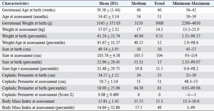 ABSTRACTBackground: During 2016-2020, 12,955 cases of Zika virus (ZIKV) infections were reported in México, where Yucatán was the second state with a high prevalence. However, the neurological development of children with gestational exposure to these viruses has been poorly studied. Aim: We aim to describe the neurodevelopmental status of infants exposed to ZIKV during pregnancy in Yucatán, México. Methods: Infants aged 4-5 years exposed in utero to ZIKV were first evaluated with the Child Development Assessment 2nd version test (EDI-ll) and later with the Battelle Inventory 2nd version test (IDB-ll). The anthropometric characteristics were evaluated using the Intergrowth 21st Calculator application, the Body Mass Index calculator developed by the CDC, and the WHO head circumference chart. Results: Fifty infants without microcephaly were included, the median age of 54.42 ± 3.14 months; 28% presented lag, and 14% showed a risk of delay. The Fine Motor and Communication areas were the most affected (24% and 20%, respectively), followed by Language (16%), Social (12%), and Gross Motor (8%). At reassessment, 64.3% were reclassified as normal and 14.3% remained at risk of delay. The IDB-II test identified neurodevelopmental lags of 10–20 months to chronological ages, with a greater lag in the Expressive area and a smaller lag in the Cognitive area. A higher frequency of neurodevelopmental disorders was found in the second trimester of pregnancy. However, exposure during the first trimester of pregnancy coincided with a higher frequency of risk of delay. Conclusion: Our results emphasize the need to evaluate the neurodevelopment of infants with antenatal exposition to ZIKV, during the first 5 years of life from birth to improve their future quality of life. Key Words: Infants, Gestation, Neurodevelopment, México, Zika virus IntroductionIn 2015, the zika virus (ZIKV) was associated with neurological alterations such as myelitis, meningoencephalitis, and encephalomyelitis in infected people (de Araújo et al., 2016; de Oliveira et al., 2017). In 2016, the first case of microcephaly associated with congenital ZIKV infection was confirmed in México, where caused 12,955 autochthonous cases until epidemiological week 11 of 2021, mostly in the state of Yucatán (Hernández-Ávila et al., 2018; Secretaría de Salud, 2021). Of the 1,325 confirmed cases in Yucatán, 69.88% (926 cases) occurred in pregnant women (Secretaría de Salud, 2021). Brain architecture develops during the first 3–5 years of life, favoring the development of the senses, learning, memory, and healthy behaviors of human development (Shonkoff and Karakowsky, 2014; Pérez-Escamilla et al., 2017). Child development can be altered by complications during pregnancy or childbirth, lack of neurologic stimulation, malnutrition, chronic health problems, and environmental factors (Medina et al., 2015; Gómez-Andrés et al., 2020). ZIKV infection can cause severe brain abnormalities, fetal death, mental retardation, sensorineural deafness (Ventura et al., 2016a; Costello et al., 2017; Schwartz, 2017), and/or eye lesions (de Paula-Freitas et al., 2016; Ventura et al., 2016b). Babies with intrauterine exposure to ZIKV without Congenital Zika Syndrome (CZS) may be at neurodevelopmental risk in the first months of gestation and the first years of life. En México, the impact on the neurological development of children with gestational exposure to the ZIKV has been poorly studied. We aim to describe neurodevelopment in 4–5-year-old infants exposed to ZIKV during pregnancy in Yucatán, México. Materials and MethodsA descriptive cross-sectional study of neurological development was carried out in infants aged 4–5 years, exposed to ZIKV during pregnancy, born at the Regional General Hospital 1 (HGR1) of the Mexican Institute of Social Security (IMSS) in Yucatán, México. The information on maternal gestational conditions, including confirmation of ZIKV infection by RT-qPCR, was retrospectively obtained from the Coordination of Information and Strategic Analysis of the IMSS Yucatán, the Pediatric Service, and the Department of Epidemiology of the HGR1. Clinical and epidemiological data of the mothers who tested positive for ZIKV infection and newborns were obtained from the National Epidemiological Surveillance System and the Epidemiological Control System. Infants with congenital syndromes or congenital infection by agents of the TORCH complex, perinatal asphyxia, and neurological damage from causes other than ZIKV, were excluded. The protocol was approved by the Ethics Committee and the National Committee for Scientific Research of the IMSS with registration number R-2021-785-044. This protocol had no funding. The information on the gestational and postnatal conditions of the infants was obtained from hospital records or provided by the mother, from the WHO growth tables, and the Intergrowth 21st Calculator application (Villar et al., 2013). Height and weight were analyzed using the Body Mass Index (BMI) calculator for children and adolescents. A stimulating environment was considered if infants habitually talked, played, and shared skills and interests with their caregivers. The Child Development Assessment 2nd version (EDI-II) which was developed and validated in México for children under 5 years of age (Rizzoli-Córdoba et al., 2013), was used to classify development as normal, lagged, and at risk of delay with 0.81 sensitivity and 0.61 specificity. The infants with developmental lag or at risk of delay in one or more evaluated areas, performed stimulation exercises according to the altered areas. Later they were reassessed with the EDI-II test and with the Battelle Inventory 2nd version (IDB-II) test. The data were analyzed in frequencies, measures of central tendency, and dispersion with the statistical package SPSS V 25. ResultsMaternal and neonatal characteristics during gestation. A population of 83 pregnant women confirme