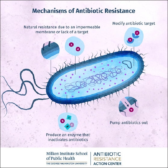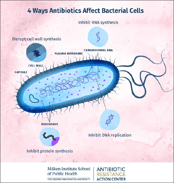 Fig. 2. Mechanisms of antibiotic action on bacteria. (Image courtesy: Milken Institute School of Public Health). Several bacteria like S. aureus, P. aeruginosa, and E. coli may form polymeric particles that accumulate outside the bacterial cell. Within these aggregated substances, several bacterial species live. This is called a biofilm, which protects bacteria from the action of antimicrobial agents and other toxins (Fig. 1). The enhanced virulence exhibited by bacterial biofilms may result in severe clinical complications with fatal consequences (Coll et al., 2024). In many bacteria, biofilms may also result in the persistence of disease as well as resistance to prescribed antibiotics (Zhang et al., 2009). The recognized factors that allow organisms in biofilms to resist antibiotics include: (i) polymeric matrix restricting the entry of antimicrobials, (ii) preventing the contact of antimicrobials with biofilm, (iii) bacteria producing enzymes like penicillinase/extended spectrum beta lactamase (ESBL), (iv) bacteria inside the biofilm might alter its multiplication rate and respiration processes, (v) bacterial binding sites may get altered as well as these sites may not be exposed, (vi) removal of antimicrobials with the help of active transporters/efflux pumps, and (vii) possession of lipopolysaccharide (LPS) cell walls, generally prevents the action of beta lactam antibiotics. In addition, exopolysaccharide sheaths formed by biofilm-producing bacteria significantly decrease their antibiotic susceptibility. Such organisms include S. aureus, Enterococcus, and K. pneumoniae. The latter is considered to be a significant cause of health care-associated pneumonia associated with high morbidity and mortality (McCowan et al., 2022).