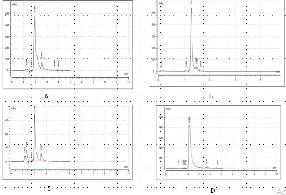 Fig. 2. Chromatograms of secondary metabolites from bacteria associated with wasp. (a) Chromatogram of the control drug (Ciprofloxacin), at 280nm, (b): Chromatogram of the Enterocin extracted from E. faecalis (OR656467) at 280nm, (c): Chromatogram of the phenazine extracted from Pseudomonas fraji (OR150689) at 280 nm and (d): Chromatogram of Gallidermin extracted from Staphylococcus gallinarium (OR150692) at 280 nm. Table 4. Evaluation of clinical potential of secondary metabolites via STRING analysis.