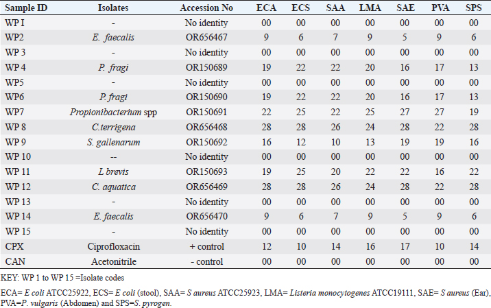 ABSTRACTBackground: Antibiotic resistance is a global problem with high morbidity and mortality in healthcare institutions that requires an antimicrobial alternative and little is known of antibacterial agents derived from insect sources. Aim: The aim of the study was to examine the antibacterial properties of secondary metabolites from insect-associated bacteria. Methods: Thirty-three wasps were obtained from abandoned structures in a local Community. Bacteria were isolated and identified by the Sanger sequencing method. The metabolites were extracted and antibacterial potential was tested against different pathogens. The metabolite concentration was analyzed via high-performance liquid chromatography (HPLC). The metabolites and their clinical potential were explored through STRING analysis. Results: Fifteen bacteria were isolated and 9 exhibited antibacterial properties consisting of Enterococcus faecalis (2). Pseudomonas fragi (2), Propionibacterium spp (1), Comamonas terrigena (2), Staphylococcus galinarum (1), Levi lactobacillus brevis (1). Antibiogram revealed that the secondary metabolite had inhibitory effects against all pathogens. The HPLC results indicated that the control and metabolites were eluted at 1.288 and 1.259 minutes, respectively, with concentrations ranging from 16.68 to 4761.82 mg/l. STRING analysis showed that the metabolites were gallidermin, enterocin, propionicin, and phenazine. Conclusion: The study concluded that the metabolites show activity against test strains and therefore a source of novel antimicrobials for addressing global drug-resistant pathogens. Keywords: Antibacterial Properties, HPLC, In-silico analysis, Secondary metabolites, Wasp-associated bacteria. IntroductionAntibacterial drug resistance has emerged as a grave global health concern, contributing significantly to morbidity and mortality in healthcare institutions worldwide (Oliver et al., 2011). Each year, antibacterial drug resistance is responsible for around 5 million fatalities, causing extended hospital stays, treatment inefficacies, and an increasing reliance on expensive second and third-line antibacterial drugs, further complicating the treatment landscape (Laxminarayan, 2022). In the United States, alarmingly high drug resistance rates have been observed in bacteria with antibiotics such as methicillin, levofloxacin, ciprofloxacin, and clindamycin (Murray et al., 2022). In Europe, multidrug-resistant bacteria are responsible for over 400,000 infections and 25,000 deaths each year (Nwobodo et al., 2022). Likewise in Sub-Saharan Africa and South Asia, the death rates per 100,000 population directly attributed to antibacterial resistance at 24%–22%, respectively. These regions also have high associated death rates (99 and 77 per 100,000) (Nwobodo et al., 2022). The prevailing antibiotic resistance made pharmaceutical companies across the globe introduce different strategies in drug development to combat the drug resistance menace. However, the antibiotic pipeline continues to dwindle, and resistance emerges to successive generations of antibiotics, including tetracycline, macrolides, aminoglycosides, ampicillin, and chloramphenicol (Imran et al., 2018). Even sulphonamides, introduced after the development of resistance to penicillin, faced resistance issues (Laxminarayan, 2022). The introduction of fluoroquinolones as powerful, broad-spectrum antibiotics was a significant milestone in the fight against resistant strains. Nevertheless, resistance to fluoroquinolones emerged, contributing to over 70% of antibiotic resistance-related deaths across all pathogens. Subsequently, the antibiotic colistin was introduced, but resistance developed rapidly. Other alternatives, including phage therapy, nano-treatment, fungi-based sources, and plant-based therapies, were explored but also faced resistance challenges (Laxminarayan, 2022). Innovative approaches are essential to address this pressing public health issue and develop alternative treatments for bacterial infections. Given the failures of antibiotic generations and alternative therapies, there is a growing need to explore novel methods for treating microbial infections. Antibacterial agents sourced from insects remain limited. Hence, exploring antibiotic properties of secondary metabolites produced from wasp-associated bacteria holds promise. Materials and MethodsResearch designThe research design was experimental involving laboratory testing and analysis. The study was conducted at the Department of Microbiology Postgraduate Laboratory, School of Science and Technology, Babcock University, Ilisan-Remo, Ogun State. Collection of samplesThirty-three matured wasps, specifically Sceliphron caementarium (black and yellow wasp), were collected from abandoned buildings in Ishara, Remo, Ogun State, between March and April 2022. The wasp nests from walls and ceilings were dislodged with a broom, followed by capturing the wasps using an aerial net. With the aid of protective hand gloves, the wasps were gently removed from the net, transferred to a sealed plastic container, and transported to the Microbiology laboratory at Babcock University. Microbial isolationMicrobial isolation was conducted using Streptomyces agar supplemented with nystatin. Collected Wasps were subjected to processing, involving serial dilution at a 1:10 dilution (equivalent to a 10-fold dilution), followed by plating on Streptomyces agar for a 7-day incubation period at 37°C. Pure cultures were successfully acquired, streaked onto fresh plates, and then preserved at a temperature of 4°C. Molecular analysis for bacterial genomic DNADNA extraction from bacterial cultures was conducted using Zymo Research’s Quick-DNA™ Fungal/Bacterial Miniprep Kit, involving Proteinase K treatment, centrifugation, and column-based purification. DNA integrity was verified using agarose gel electrophoresis, and DNA yield was quantified with a Qubit 2.0 fluorometer. Molecular identification