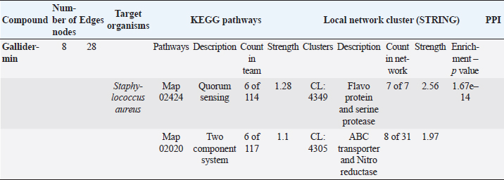 The PPIN comprises 8 nodes representing protein-relevant genes, interconnected by 28 edges that signify interactions between proteins (S. aureus) and bioactive molecules (Gallidermin). The size and color of the nodes convey information about the degree values. Bioactive molecules are depicted by pill-shaped nodes, whereas proteins are represented by spheres. Nodes that share associations are linked by edges, with the length of the lines indicating bond affinities. A shorter edge denotes higher affinity between chemicals and proteins, while a longer one signifies lower affinity. Table 5. Analysis of gallidermin-associated KEGG pathways, and local network cluster.