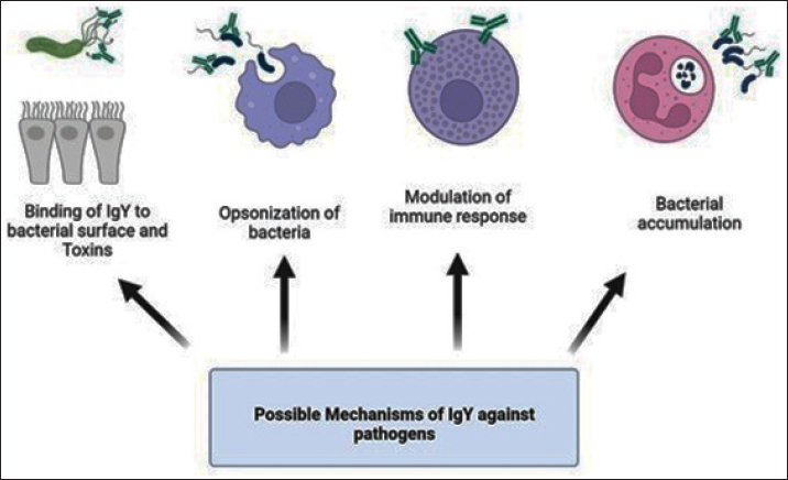 Fig. 1. Different hypotheses of IgY antibody response to bacterial infections designed by BioRender website (https://www.biorender.com/). Table 1. Advantages and disadvantages of immunoglobulin Y (IgY).