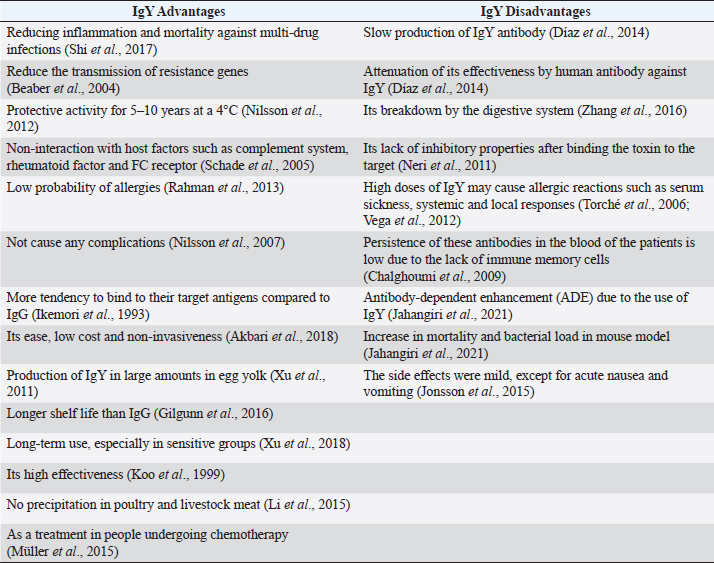 In a clinical trial, all participants reported mild side effects except for one who experienced severe nausea and vomiting (Jonsson et al., 2015). More investigations on the appropriate dosage and administration route can minimize patient complications. Table 1 lists the advantages and disadvantages of using IgY antibody. According to the above studies, the problems of using this antibody can be solved by eliminating side effects such as ADE through appropriate doses and routes of administration and recombinant antigens. In addition, determining the appropriate release methods and taking frequent doses increased its stability and effectiveness in the body. ConclusionThe excessive use of antibiotics and the emergence of antibiotic resistance have led to the development of new treatment technologies. One of these methods is the use of antibodies as passive immunity. Antibodies have a natural structure similar to human proteins, making them an effective tool in treating various microbial infections. Previous studies have shown that their side effects or minor disadvantages, such as ADE, can be eliminated with the help of bioinformatics methods and the production of recombinant antigens. However, more research is needed to determine their appropriate dose and route of administration for widespread use in various infections. AcknowledgmentsNot applicable. Conflict of interestThe authors state no conflicts of interest that could have influenced this work. FundingNone. Authors’ contributionsZ.E and S.K prepared the initial manuscript. K.G, M.K, and Z.E were responsible for drafting and editing the final article. K.G was the supervisor too. All authors have read and approved the final manuscript. Data availabilityAll data are provided in the manuscript. ReferencesAkbari, M.R., Ahmadi, A., Mirkalantari, S. and J. Salimian 2018. “Anti-vibriocholerae IgY antibody inhibits mortality in suckling mice model.” J. Natl. Med. Assoc. 110(1), 84–87. Amro, W.A., Al-Qaisi, W. and Al-Razem, F. 2018. “Production and purification of IgY antibodies from chicken egg yolk.” J. Genet. Eng. Biotechnol. 16(1), 99–103. Bansal, V., Malviya, R., Malaviya. and Sharma, P.K. 2014. “Novel prospective in colon specific drug delivery system.” Polim. Med. 44(2), 109–118. Beaber, J.W., Hochhut, B. and Waldor, M.K. 2004. “SOS response promotes horizontal dissemination of antibiotic resistance genes.” Nature 427(6969), 72–74. Carlander, D., Stålberg, J. and Larsson, A. 1999a. “Chicken antibodies: a clinical chemistry perspective.” Ups. J. Med. Sci. 104(3), 179–189. Carlander, D., Sundstrom, J., Berglund, Å., Larsson, A., Wretlind, B. and Kollberg, H. 1999b. “Immunoglobulin Y (IgY) A new tool for the prophylaxis against Pseudomonas aeruginosa in cystic fibrosis patients.” Pediatr. Pulm. 18, 240. Chalghoumi, R., Marcq, C., Thewis, A., Portetelle, D. and Beckers, Y. 2009. “Effects of feed supplementation with specific hen egg yolk antibody (immunoglobin Y) on Salmonella species cecal colonization and growth performances of challenged broiler chickens.” Poult. Sci. 88(10), 2081–2092. Champion, J.A. and Mitragotri, S. 2006. “Role of target geometry in phagocytosis.” Proc. Natl. Acad. Sci. 103(13), 4930–4934. Dávalos Pantoja, L., Ortega Vinuesa, J.L., Bastos González, D. and Hidalgo Alvarez, R. 2000. “A comparative study between the adsorption of IgY and IgG on latex particles.” J. Biomater. Sci. Polym. Ed. 11(6), 657–673. Díaz, P., Malavé, C., Zerpa, N., Vázquez, H., ’Suze, G.D., Montero, Y., Castillo, C., Alagón, A. and Sevcik, C. 2014. “IgY pharmacokinetics in rabbits: implications for IgY use as antivenoms.” Toxicon 90, 124–133. Feng, Y., Liu, W. and Shi, D. 2013. “Effectiveness of egg yolk antibody against shiga toxin II variant toxicity in vitro and in vivo.” Curr. Microbiol. 67(4), 448–453. Gadde, U., Rathinam, T. and Lillehoj, H.S. 2015. “Passive immunization with hyperimmune egg-yolk IgY as prophylaxis and therapy for poultry diseases--a review.” Anim. Health. Res. Rev. 16(2), 163–176. Gilgunn, S., Millán Martín, S., Wormald, M.R., Zapatero-Rodríguez, J., Conroy, P.J., O’Kennedy, R.J., Rudd, P.M. and Saldova, R. 2016. “Comprehensive N-Glycan Profiling of Avian Immunoglobulin Y.” PLoS One 11(7), e0159859. Hamal, K.R., Burgess, S.C., Pevzner, I.Y. and Erf, G.F. 2006. “Maternal antibody transfer from dams to their egg yolks, egg whites, and chicks in meat lines of chickens.” Poult. Sci. 85(8), 1364–1372. Hofmann, T., Schmucker, S.S., Bessei, W., GrashornM. and Stefanski, V. 2020. “Impact of housing environment on the immune system in chickens: a review.” Animals 10; doi: 10.3390/ani10071138. Ikemori, Y., Peralta, R.C., Kuroki, M., Yokoyama, H. and Kodama, Y. 1993a. “Research note: avidity of chicken yolk antibodies to enterotoxigenic Escherichia coli fimbriae.” Poult. Sci. 72(12), 2361–2365. Ikemori, Y., Peralta, R.C., Kuroki, M., Yokoyama,H. and Kodama, Y. 1993b. “Research note: avidity of chicken yolk antibodies to enterotoxigenic Escherichia coli Fimbriae.” Poult. Sci. 72(12), 2361–2365. Jahangiri, A., Owlia, P., Rasooli, I., Salimian, J., Derakhshanifar, E., Aghajani, Z., Abdollahi, S., Khalili, S., Talei, D. and Eslam, E.D. 2021. “Specific egg yolk immunoglobulin as a promising non-antibiotic biotherapeutic product against Acinetobacter baumannii pneumonia infection.” Sci. Rep. 11(1), 1914. Joiner, K.A., Brown, E.J. and Frank, M.M. 1984. “Complement and bacteria: chemistry and biology in host defense.” Annu. Rev. Immunol. 2, 461–491. Jonsson, A.K., Larsson, A., Tängdén, T.,Melhus, Å. and Lannergård, A. 2015. “A trial with IgY chicken antibodies to eradicate faecal carriage of Klebsiella pneumoniae and Escherichia coli producing extended-spectrum beta-lactamases.” Infect. Ecol. Epidemiol. 5, 28224. Keller, M.A. and Stiehm, E.R. 2000. “Passive immunity in prevention and treatment of infectious di
