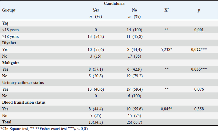 It was determined that 23.7% of the patients were admitted to the hospital due to gastrointestinal problems, 13.2% had cardiovascular, 13.2% had neurological diseases, and 13.2% had a history of infectious diseases. There were no patients with a history of burns or trauma as an indication for hospitalization. All of the patients received antibiotic therapy and antifungal therapy. Half of the patients used 3-4 different antibiotics. The antibiotics they use; it was observed that they used carbapenem the most, cephalosporin in second place, and penicillin in third place. Data on candidemia detected in patients are given in Table 2. When the types of candidemia detected in the patients included in the study were examined, C. albicans in 65.8%; non-albicans strains were found in 34.2% of them. It was determined that the detected non-albicans consisted of species such as C. tropicalis (n=5), C. parapsilosis (n=4), C. krusei (n=2), C. glabrata (n=1), and C. membranifaciens (n=1). In addition, candiduria was detected in 34.2% of the patients.Some data with candida species are compared in Table 3. The relationship between surgery, urinary catheter, central venous catheter, blood transfusion, hemodialysis, TPN, and Candida type was not statistically significant (p > 0.05). It was determined that more than half of the patients with candiduria underwent a urinary catheter and blood transfusion, although it was not statistically significant. The relationship between renal failure and candida type was found to be statistically significant (p < 0.05). Accordingly, it was observed that non-albicans Candida type was more common in patients with renal failure and C. albicans type was more common in patients without renal failure. The relationship between diabetes, hypertension, malignancy, neutropenia, and candida type was not statistically significant (p > 0.05). Some sociodemographic characteristics were compared with candiduria and given in Table 4. The relationship between age group and candiduria was found to be statistically significant (p < 0.05). Accordingly, it was observed that the development of candiduria was higher in adult patients than in newborns. It has also been determined that patients with diabetes and malignancy have more Candidia. DISCUSSIONCandida is one of the most important types of fungal infections that are becoming more common. It causes the rapid colonization of candida species on the human organism. Although invasive interventions such as catheter application to patients cause this colonization, it has been reported in the literature that the use of broad-spectrum antibiotics and abdominal surgery in patients hospitalized in intensive care units, those receiving immunosuppressive therapy, and abdominal surgery are factors that increase the risk of infection (Altun et al. 2023). In this study, 3. It was determined that there were 38 patients diagnosed with candida and candiduria in the intensive care units of a step-training and research hospital within a 5-year period. In a study, it was reported that 30 candidemia infections were produced in the one-year Intensive Care Unit, the majority of which were non-C. albicans species. In the same study, it was reported that the one-year incidence of candidemia was 14.72 per 1000 patients (Kerget et al. 2020). In a study conducted in a tertiary care hospital, 150 healthcare-associated (SHI) candidemias were detected in all clinics according to the patient files examined retrospectively between 2014 and 2019 (Çeviker et al. 2020). When the years covered by our study periods are compared with the years covered by other studies, it is seen that there is an increase in candida infections over the years. In this study, C. albicans was seen in 65.8%, while the incidence of other species was 34.2%. In the study conducted in a tertiary care hospital, it was reported that C. albicans was detected more than other species (66.3%), and C. albicans was the highest in all intensive care units where the study was conducted (Eren et al. 2023). Candida albicans has been frequently reported in Serbia, China, Australia, and Turkey. Candida albicans was reported to be most frequently isolated in Serbia (Arsic et al. 2018), China (Guo et al. 2017), Australia (Chapman et al. 2017), the Netherlands (Wouters et al. 2018), and Turkey (Yeşilkaya et al. 2007; Bilgi et al. 2015). It is seen that the majority of patients with candidemia are adults. In our study, it was determined that 63.2% were 18 years of age or older. Candida species were detected in 176 (11.2%) of a total of 1576 clinical urine samples in India, while the incidence rate was high in the 21–30 age group, it was reported that the lowest incidence was in the 71–80 age group (Mishra et al. 2022). In a study conducted in pediatrics clinics, it was reported that candida infection was detected in 37 cases over a period of 4 years (Ertek 2020). In another study, the mortality rate from candidemia was 9.5% in children (Çetin et al. 2024). In a study conducted in a tertiary care hospital, it was reported that the most frequently isolated species from all samples were C. albicans (n=185/279, 66.3%), while it was seen in the pediatric intensive care unit (n=11/17, 64.7%) (Eren et al. 2023) This shows that candida infections are more common in adult patients. Table 3. Comparison of some data with Candida species.
