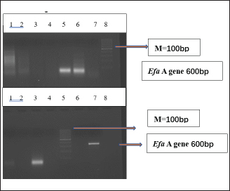 Fig. 2. Distribution of efaA among E. faecalis isolates. M, 100 bp DNA marker; Lane 1 and Lane 2: the band represents the presence of efaA gene (600 bp).