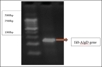 Fig 4. AlgD gene in MDR P. aeruginosa isolate PCR band of 1,000 bp represents the presence of AlgD gene on 2% agarose gel after comparison with 5,000 bp molecular marker.