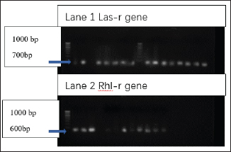 Fig. 5. PCR amplification bands representing the presence of las-r and rhlR biofilm genes in P.aeruginosa isolates (700 and 600 bp). Lane 1: 100b bp DNA marker, Positive amplification of the las-r gene in 3–9 (14 samples). Lane 2 : 100 bp DNA marker,;positive amplifications of rhl-R gene were observed sample 1–3, sample 7, 9, 10, and 11 (8 samples of P. aeruginosa). DiscussionMicrobial pathogenesis involves studies that are traditionally based on evidence of virulence properties, such as the ability of a pathogen to elaborate toxins, adhere to, and invade host cells, causing tissue damage, and disrupting the normal immune system. These changes are prominent and advanced in the etiology of UTI. Since UTI is the most frequently diagnosed urologic disease in patients with DM, it is equally important to study the factors directly related to the virulence of UTI pathogens. UPEC is the major causative agent of UTI (Holden et al., 2006). UTIs are considered acute, self-limiting infections despite the prevalence of recurrent infection two or more times within months of a primary infection. The currently recognized virulence factors such as Cnf gene accounts for only a fraction of the total virulence of wild-type strains, suggesting that other as-yet-unidentified properties that are important determinants of virulence await discovery and characterization. Because limited studies have identified the role of Cnf gene in UPEC in vivo, this study investigated this gene from the bacterial isolates grown in vitro. This simple method of PCR detection and observation suggests an intriguing new line of study for investigators interested in the pathogenesis of UTI and also reflects the fact that cnf gene can be directly involved in the etiology of ascending UTI in patients with diabetes. However, very few studies have described the epidemiology and clinical importance of VRE in urinary isolates. Our study demonstrated that VRE urinary isolates are present in patients with diabetes and a history of UTI. Our data indicates that despite the predominance and widespread distribution of the vanA resistance determinant, the vanB genotype has become well established and shows remarkable stability in the diabetic population (Dahl et al., 1999). Glycopeptide susceptibilities and PCR revealed that the VanA genotype is widely disseminated among VREs isolated from patients with DM. Because recurrent UTI’s are more frequent in patients with DM, it is important to treat UTIs with VRE in the future. Virulent factors of E. faecalis include adherence to host tissue, invasion, and abscess formation, modulation of host inflammatory responses, and secretion of various products that enhance infection. Therefore, more investigation on potential virulence factors like efa gene of E. faecalis, would be useful in understanding their role in UTI. Moreover, clinical isolates of E. faecalis recovered from UTI isolates can exhibit resistance to conventional treatment regimens recommended for UTI. Thus far, efa has been only associated with the virulence of endocardiatis; however, less evidence is available on the role of this gene in causing acute UTI. This study showed that all E. faecalis isolates were associated with UTI, especially in patients with diabetes, as they carried the efa gene. Our study thus indicates that efa gene also has a potential role in the pathophysiology of UTI, as this gene can be responsible for bacterial adhesion, despite the fact that only a few UTI isolates were found positive for carrying this gene. Our results revealed a significant difference between the proportion of MDR P. aeruginosa strains isolated from diabetic patients belonging to the Lower socioeconomic status expressed one of the key virulence genes. Numerous reports have documented that the rise in MDR nosocomial P. aeruginosa continues to threaten hospitalized patients despite various measure, including isolation techniques and antibiotic de-escalation therapy. Whether MDR P. aeruginosa strains necessarily express a more virulent phenotype remains controversial. This study initiated the isolation of MDR P. aeruginosa clinical strains for their ability to disrupt the integrity of human cultured intestinal epithelial cells and correlated these findings to related virulence phenotypes such as adhesiveness, motility, biofilm formation, and cytotoxicity, which have been previously documented in earlier studies (López-Jácom et al., 2019). These strains were characterized and found to harbor the algD gene and to display high swimming motility and adhesiveness. We observed a significantly higher spread of the virulence genes las-R and rhl-R among MDR P. aeruginosa isolates. Our experiments, which included analysis of biofilms among the P. aeruginosa isolates, significantly reflected high antimicrobial resistance to β-lactams and aminoglycosides.