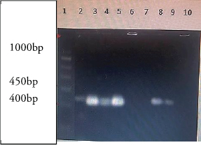 Fig. 7. Lane 1 is the 1,000 bp molecular size standard. Band of 400 bp represents mec A amplification in MRSA isolates.