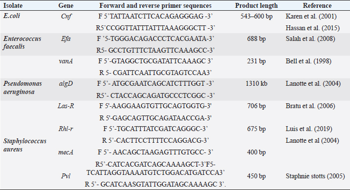 Plasmid DNA extraction and purificationPlasmid DNA from UTI isolates was purified using the method described by P. courvalin (Antibiotic Resistance Techniques, 5th edition, Pasteur Institute, 2008) A loopful of stock culture of each UTI isolate was inoculated into 5 ml of Brain Heart Infusion (BHI) broth and incubated overnight at 37°C under appropriate conditions. 2 ml of the overnight cell suspension was centrifuged at 15,000 rpm for 5 minutes in a refrigerated centrifuge. The resulting pellet was re-suspended in 100 µl of TE buffer (Tris-HCl 10 mM, pH 8.0; EDTA 1 mM). For gram-positive Enterococcus species, the pellet was further resuspended in 100 µl of TGE-lysozyme and incubated at 37°C. A 200 µl of NaOH-SDS solution was added to the mixture, which was gently vortexed by inverting the tube 4–5 times. The mixture was allowed to stand on ice for 5 minutes. 150 µl of potassium acetate solution was added, and the tube was placed on ice for an additional 10 minutes. Phenol-chloroform extractionA 200 µl of Tris-saturated phenol (Bangalore Genei India Pvt., Ltd.) and 200 µl of chloroform were added and well mixed by vortexing. The mixture was centrifuged for 3 minutes, and 400 µl of the upper aqueous layer (supernatant) was carefully transferred to a fresh tube without disturbing any white residues. The supernatant was washed with 800 µl of absolute ethanol and then centrifuged. The pellet was washed with 70% ethanol and centrifuged for an additional 5 minutes. The pellet was air-dried and resuspended in 100 µl of TE buffer (Tris-HCl 10 mM, EDTA, pH 8.0) with 1 µl of RNAse (Chromous Biotech Pvt Ltd). Detection of the cytotoxic necrotizing factor type 1 (Cnf) gene in E .coli by PCRCytotoxic necrotanizing factor type 1 (cnf) is a virulent gene found in many strains of uropathogenic E. coli. Primers for this gene were synthesized according to the sequence and PCR method described (Rippere-Lampe et al., 2001). The primer sequences for the cytotoxic gene (Table 3) were added in the reaction method prepared according to the method mentioned above for all consecutive PCRs. The PCR Reaction was set at the following cycling conditions in a thermocycler for denaturation: 30 consecutive cycles of 1 minutes at 95°C, 1 minutes at 50°C, and 3 minutes at 72°C with a final extension at 72°C for 10 min. All PCR products were examined on 1.5% agarose gels (Fig. 1). Detection of Van A gene Enterococcus faecalis using polymerase chain reactionPrimers for two virulent-associated genes VanA associated with Vancomycin resistance in vancomycin-resistant Enterococcus (VRE) and a cell wall adhesion factor (efa) which is expressed in urine were synthesized according to the sequences and PCR methods described by (Shepard and Gilmore, 2002; Baba-Moussa et al., 2008; Bell et al., 1998; Salah et al., 2008) . PCR conditions for efa gene were accomplished by a PCR thermocycler (MJ research- INC, USA) and were obtained at 15 minutes initial enzyme activation, DNA denaturation step at 95°C followed by 35 consecutive cycles at 94°C for 20 s, 68°C for 45 s, and 72°C for 15 s according to the primer sequences discussed in Table 2. The cycling conditions followed were initial denaturation at °C for 10 min, followed by annealing at 94°C for 1 min, 50°C for 1 min, and extension at 72°C for 1 minutes for 40 cycles and 72°C for 5 mins for the vanA gene. All PCR products were examined on 1.5% agarose gels (Figs. 2 and 3). Table 2. Primer sequences for PCR assays of target genes of UTI isolates.