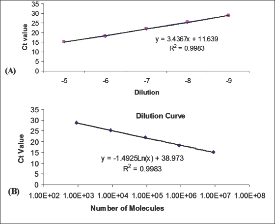Fig. 1. Real-time quantitative PCR. (A): Standard curve. (B): Number of molecules per Ct value.