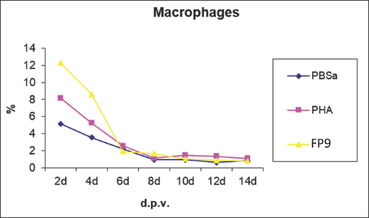 Fig. 5. Kinetics of macrophage numbers in skin sections of birds vaccinated with FP9. % represents the percentage of the field of view staining positive with an anti-macrophage monoclonal antibody (KUL01), PBSa represented the negative control whereas PHA represented the positive control.