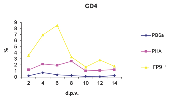 Fig. 7. Kinetics of CD4+ T cell numbers in skin sections of birds vaccinated with FP9. % represents the percentage of the field of view staining positive with an anti-CD4+ T cell monoclonal antibody (AV29), PBSa represented the negative control whereas PHA represented the positive control. CD4+ T cellsSkin sections were stained with the monoclonal antibody AV29, which recognizes CD4+ T cells (Davison, IAH) (Fig. 6). Numbers of CD4+ cells increased slightly from 2 dpv compared to birds inoculated with PBSa and PHA. CD4+ T cells gradually increased to reach a peak at 6 dpv at the site of vaccination in the skin, followed by a gradual decrease from 8 dpv onwards (Fig. 7). CD8+ T cellsSkin sections were stained with the monoclonal antibody AV14, which recognizes CD8+ T cells (Tregaskes et al., 1995) (Fig. 8). CD8+ cells increased rapidly and sharply starting from 4 dpv, and reached a peak at 6 dpv at the site of vaccination in the skin, and then dropped rapidly from 8 dpv onwards (Fig. 9). B cellsSkin sections were stained with the monoclonal antibody AV20 which recognizes Bu-1 on B cells (Rothwell et al., 1996) (Fig. 10). B cells increased in number from 2 dpv to reach a peak at 6–8 dpv at the site of vaccination in the skin, and then dropped in number from 10 dpv onwards (Fig. 11). At 2 and 4 dpv, B cells in skin sections were diffused. The formation of germinal centers (GC)-like structures started appearing at 6 dpv (Fig. 10). At 8 dpv onwards, almost all B cells were aggregated in these GC-like structures. DiscussionPrevious studies indicate that an intradermal inoculation of FPV (both challenge and vaccine strains) into the comb of birds resulted in primary lesions that were restricted to the site of inoculation (Minbay and Kreier, 1973). Local multiplication resulted in the development of lesions at the site of virus entry. Typically, primary lesions appeared by the Fourth day and disappeared by the third week. No secondary lesions developed in any of the birds. No virus was detected in the blood, and the internal organs were free of virus during the infection (Minbay and Kreier, 1973). The challenge FPV was detected on the second day from the lesion samples collected from the comb (site of inoculation). Thereafter, the virus titer increased rapidly to a maximum on the ninth day, and then fell from the 12th day onwards. No virus was detected at 27 dpi. Virus persistence was shorter and virus concentration was lower with the vaccine strain than the challenge strain (Minbay and Kreier, 1973). Another study (Singh et al., 1987) showed that in chickens infected with fowlpox intradermally, the virus was detected in the lungs at 4 dpi which was followed by viremia, at 5 dpi.