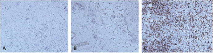 Fig. 4. Skin sections of birds stained with monoclonal antibody KUL01 against macrophages. Two days post inoculation with (A) PBSa, (B) PHA, and (C) FP9. Positive staining for macrophages appeared brown (100x magnification).
