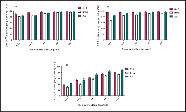 Antioxidant activityRadical scavenging capacity Radical scavenging capacity was measured using 2,2-diphenyl-1-picrylhydrazyl (DPPH) and 2,2′-azinobis (Arreola et al., 2015)-ethylbenzothiazoline-6-sulfonic acid (ABTS) assays and expressed as the percent inhibition of radical activity (Fig. 1). The ability of the HT extract to scavenge ABTS and DPPH radicals was compared with that of the standards BHA and AA.