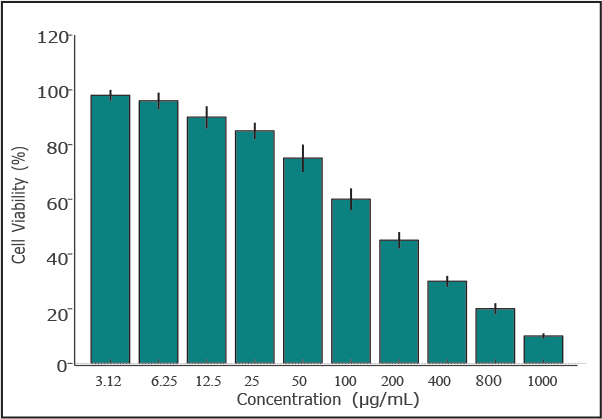 Figure 3. Cytotoxicity of Hypericum triquetrifolium (HT) leaf extract in MRC-5 human lung fibroblast cells following treatment with concentrations ranging from 3.12 to 1,000 µg/ml. Data are presented as mean ± standard deviation (n=3). Antiviral activityVirus-induced CPE occurred 72 hours after infection. The virus was titrated, and the median tissue culture infectious dose (TCID50)/ml in extract-treated and control samples was determined. After 72 hours, the HT extract reduced the viral titer by >1 log10 and 1.5 log10 at 50 and 100 µg/ml, respectively (Fig. 4). The antiviral effect of the extract was assessed by determining the reduction in virus-induced CPE using monolayers of cells stained with crystal violet. Without the HT extract, HCoV 229E had a lower CPE at low MOI (Fig. 5). No CPE was observed in infected cells with an MOI of 0.004 treated with 50 µg/ml HT extract. At 100 µg/ml, the extract reduced CPE by more than 10%. The CPE reduction remained significant at higher MOIs; at 50 µg/ml, the extract reduced CPE by 38% and 43% at MOIs of 0.04 and 0.4, respectively. The 100 µg/ml dose of extract yielded a more moderate antiviral effect and reduced the CPE by 33.4% and 27% at MOIs of 0.04 and 0.4, respectively. This reduced effect is probably due to the slightly higher cytotoxicity of the extract at this concentration. Our observations under a microscope confirmed the substantial reduction of HCoV 229E-induced CPE (Fig. 6), particularly at lower MOI (0.004), independent of the extract concentration.