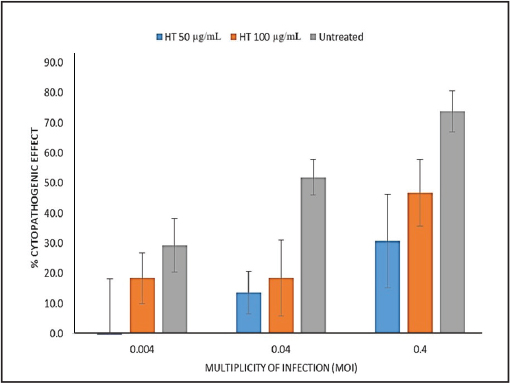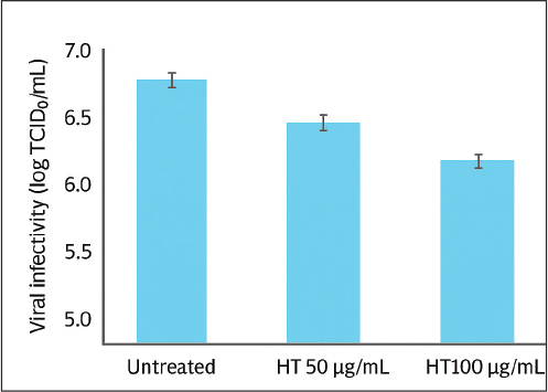 Figure 4. Antiviral activity of HT leaf extract against human coronavirus 229E (HCoV−229E). Viral infectivity, expressed as log TCID50/ml, is shown for cells treated with different concentrations of HT extract (50 µg/ml and 100 µg/ml) compared with the untreated control. Data represent mean ± standard deviation (SD) (n=3).