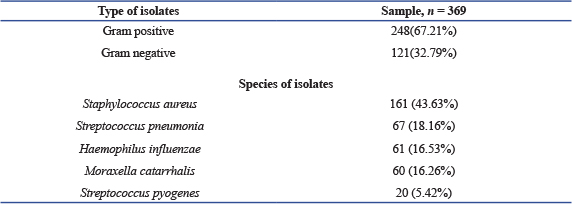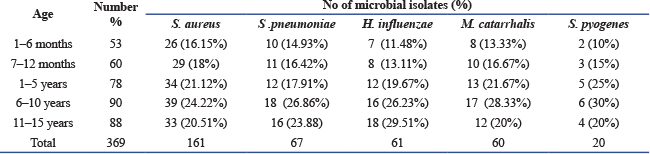 ABSTRACTBackground: Bronchial asthma is a complex, chronic condition of the airways and is one of the most prevalent pediatric illnesses worldwide and causing a significant, considerable amount of morbidity and mortality. Aim: This study aimed to identify bacterial species in the upper airway of asthmatic children, determine their antimicrobial susceptibility, and explore the role of bacterial infections in asthma exacerbations. Methods: This cross-sectional study included 369 children (195 females and 174 males) aged between 1 month and 15 years (mean age: 7.95 ± 3.95 years) from pediatric respiratory departments in hospitals across Tripoli, Libya, between January to April 2025. Demographic and clinical data were collected using structured questionnaires. Bacterial were samples collected nasopharyngeal swabs and sputum's. The bacterial isolates were identified using conventional identification techniques in accordance with normal microbiological protocols after the samples were cultivated. A Statistical analysis were conducted based on available data to examine microbial relationship to asthma in performed to examine associations between bacterial colonization, age, and gender. Results: Among 369 children, 195 (52.8%) were females, and 174 (47.2%) were males. The mean age of the children with asthma was (7.95 years ± 3.97 SD) (Range: month–15 years). Gram-positive bacteria accounted for 67.21% of isolates, while Gram-negative bacteria accounted for 32.79%. The most commonly isolated organism was Staphylococcus aureus (161; 43.63%), followed by Streptococcus pneumonia (67; 18.16% (Haemophilus influenza (61; 16.53%), Moraxella catarrhalis (60; 16.26%), and Streptococcus pyogenes (20: 5.42%). The highest culture positivity was observed in the 6–10 year age group, whereas the lowest was in infants aged 1–6 months. Most common organism grown in culture was S. aureus 161 (43.63%) followed by S. pneumonia 67 (18.16%), H. influenza 61 (16.53%), M. catarrhalis is 60 (16.26%) and S. pyogenes 20 (5.42%), Frequency distribution of isolated bacteria among children with asthma according to age, where the percentage of cultural positivity was highest in the age group 6–10 years, and the lowest rate of infection was recorded among age 1–6 months. Conclusion: Indicate these findings imply that bacterial colonization contributes to the pathogenesis of acute asthma and plays a significant role in Takes. Future research should focus on prevention and treatment strategies. Keywords: Asthma, Childhood, Bacterial colonization, Exacerbations in children, Antibiotic resistance. IntroductionAsthma is one of the most prevalent chronic illnesses in children. It is characterized by recurrent episodes of wheezing, dyspnea, chest tightness, and coughing, resulting from airway hyper responsiveness, associated with chronic inflammation (Toskala and Kennedy, 2015; Serebrisky and Wiznia, 2019). Globally, approximately 339 million people are affected by asthma worldwide (World Health Organisation, 2020). With a higher prevalence among children (9.5%) than adults (7.7%) (Loftus and Wise, 2016). Childhood asthma is in leading cause of morbidity and mortality (Asher and Pearce, 2014). The relationship between asthma and the microbial environment remain incompletely understood. Recent studies have increasingly focused on the role of microbes in the pathophysiology of asthma (Sullivan et al., 2016). Although microorganisms are known to influence airway inflammation, their specific contribution to asthma exacerbations is far less understood. Characterizing bacterial colonization in the airways of asthmatic patients could provide valuable insights into the mechanisms underlying airway inflammation and may pave the way for novel therapeutic approaches for chronic respiratory diseases such as asthma (Bokulich et al., 2016; Bush et al., 2017). Staphylococcus aureus has been frequently linked to both the onset and worsening of asthma (Langereis and de Jonge, 2015). A major Streptococcus pneumoniae infections are cause of mortality among children (Marangu and Zar, 2019). Heamophilus influenzae is among the one of the top five pathogenic bacteria that are most commonly found in young children (Eark et al., 2015). Additionally, H. influenzae can adhere to multiple receptors on the epithelium of the airways, which promotes increased inflammatory reactions (Huang and Boushey, 2014). Other respiratory pathogens, such as Mycoplasma pneumoniae and Chlamydia pneumoniae, have been detected in 5%–25% of children who experienced asthma flare-ups, while 20% of children who wheezed had Moraxella catarralis (Redinbo, 2014). Furthermore, the composition on the early-life microbiota's composition is significantly influenced by environmental factors such as formula feeding, birth mode, and antibiotic use (Jones et al., 2022). Although certain bacteria can cause acute respiratory infections by colonizing or infecting the airway, it remains unclear and hotly debated whether these specific bacterial infections are the actual cause of asthma flare-ups or serve as indicators of a higher risk of developing asthma (Simpson et al., 2016). Here, we discuss the available information about the potential contribution of infection to chronic asthma, with an emphasis on the potential role of bacteria. This study aimed to evaluate the upper airway microbial activity in children with asthma, to identify the type of bacteria and their profiles of susceptibility to the most widely used antimicrobial agents. Materials and MethodsStudy designThis study was conducted at the microbiology laboratory at the University Teaching Hospital, and pediatric respiratory departments in hospitals in Tripoli city, Libya, from January to April 2025. Study populationA total of 369 patients were included in the study, 195 females and 174 males, aged were one month and 15 years. The patients who participated in the study were from the respiratory department. Study procedureS