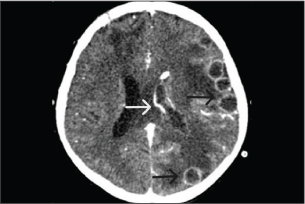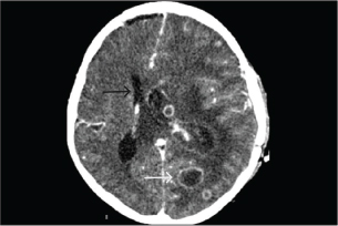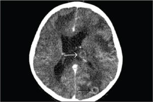 Fig. 3. A computed tomography scan of the brain with contrast on day 23 of admission showed two ring-enhancing lesions located in the left occipital lobe (black arrow) and left periventricular region, adjacent to the lateral ventricle (white arrow). Table 2. Microbiological results.