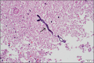 Fig. 2. Brain abscess, Hematoxylin and eosin (H&E) stain, 40×: on day 23 of admission, Fungal hyphae typically branch at acute angles in the necrotic area (black arrow). The patient was started on intravenous voriconazole with therapeutic drug monitoring (9 mg/kg/dose q 12 hours for the first two doses as a loading regimen, followed by 8 mg/kg/dose q 12 hours as maintenance therapy) in combination with amphotericin B deoxycholate (1 mg/kg/day), meropenem, and a steroid taper. Anticonvulsants (phenytoin), electrolyte correction, pain control, and supportive treatment for brain edema were provided. The patient became afebrile 3 days after initiation of antifungal therapy and abscess removal. One week after surgery, follow-up brain CT showed enlargement of multiple ring-enhancing lesions in the left frontal, parietal, and occipital lobes, left lateral ventriculitis (Fig. 3). Intraventricular amphotericin B deoxycholate 0.5 mg once daily was added to his antifungal regimen for 14 days due to a lack of radiologic response to ongoing therapy. The fungal isolate was identified as Aspergillus fumigatus on Sabouraud dextrose agar media of abscess and CSF; greenish, powdery, non-velvety colonies and lactophenol cotton blue staining showed septate hyphae, dichotomous branching, columnar conidial head, flask-shaped vesicle, limited phialide upper half of two-thirds of the vesicle, and uniseriate conidia head. Polymerase chain reaction (PCR) analysis of the brain abscess confirmed Aspergillus fumigatus, while bacterial cultures and PCR were negative (Table 2). HIV testing was negative, and lymphocyte subset analysis (CD3, CD4, and CD8) and serum immunoglobulin levels (IgA, IgE, IgG, and IgM) were within normal ranges. Neutrophil oxidative burst testing (NBT) or Dihydrorhodamine test (DHR) and lymphocyte proliferation assays were deferred, as these tests should be performed at least 1 month after blood transfusion to ensure accurate results.