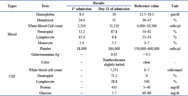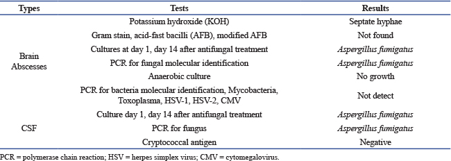 ABSTRACTBackground: Invasive cerebral aspergillosis is a rare but serious condition with a high mortality rate. Case Description: We report a case of multiple brain abscesses with ventriculitis caused by Aspergillus fumigatus in an 11-year-old Thai boy who presented with a high-grade fever and progressive headache for 9 days during hospitalization. He was diagnosed with severe acute respiratory distress syndrome and secondary hemophagocytic lymphohistiocytosis. Treatment included veno-arterial-venous extracorporeal membrane oxygenation, broad-spectrum antibiotics, and prolonged corticosteroid therapy. He subsequently developed severe headaches due to increased intracranial pressure and brain edema, which were successfully managed with a combination of antifungal therapy and extensive neurosurgery. Conclusion: Early diagnosis and combined antifungal therapy, in combination with neurosurgery, are crucial for improving survival outcomes in invasive cerebral aspergillosis. Keywords: Brain abscess, Aspergillosis, ECMO. IntroductionInvasive cerebral aspergillosis is a rare disease with a high morbidity and mortality rate exceeding 80% in immunocompromised patients (Dotis et al., 2007). Patients undergoing immunosuppressive therapy for bone marrow or solid organ transplantation, hematologic malignancies, or hemophagocytic lymphohistiocytosis, as well as those receiving prolonged corticosteroids or with chronic granulomatous disease, are at particularly high risk (Sullivan et al., 2022). Cerebral aspergillosis typically arises from hematogenous dissemination from the lungs or invasive sinus infection and usually manifests as single or multiple brain abscesses, rarely as ventriculitis or meningitis (McCarthy et al., 2014; McCarthy et al., 2017). Few cases of cerebral aspergillosis have been described in children, with rare favorable outcomes. Here, we report a case of multiple cerebral abscesses caused by Aspergillus fumigatus in a child with severe acute respiratory distress syndrome (ARDS) and secondary hemophagocytic lymphohistiocytosis (sHLH) during steroid treatment following veno-arterial-venous extracorporeal membrane oxygenation (VAV-ECMO). Case DescriptionAn 11-year-old Thai boy with a history of untreated asthma presented with high-grade fever and a productive cough for 5 days. He was admitted to a provincial hospital with a diagnosis of pneumonia and asthmatic exacerbation. Five hours post-admission, he developed respiratory failure requiring intubation. His clinical condition continued to deteriorate, characterized by profound desaturation and bilateral patchy infiltrates on chest X-ray, consistent with ARDS. Initial treatment included ceftriaxone, oseltamivir, azithromycin for pneumonia, and hydrocortisone. He subsequently developed hypotension and was treated with adrenaline, dobutamine, intravenous immunoglobulin, and pulse methylprednisolone for 2 days before being transferred to Naresuan University Hospital (NUH), Phitsanulok, Thailand, due to worsening ARDS. Upon arrival at NUH, the patient’s vital signs were: body temperature 38°C, RR 30 bpm, HR 164 bpm, BP 93/39 mmHg, and SpO2 66–73% on mechanical ventilation (FiO2 1.0). Physical examination revealed fine crepitations in both lungs and hepatosplenomegaly. Laboratory investigations showed pancytopenia, elevated ferritin levels, bone marrow aspiration demonstrating hypocellularity, and increased histiocytes with hemophagocytosis, consistent with secondary hemophagocytic lymphohistiocytosis (sHLH) (Table 1). Blood, sputum, urine, and bone marrow cultures were negative. Empirical therapy with meropenem, vancomycin, and dexamethasone 10 mg/m2/day was initiated. Table 1. Laboratory examination results.