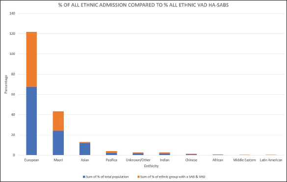 Table 1 and Figure 1 show the numbers of total inpatient admissions and VAD HA-SABs for all ethnic groups from 2008 to 2018. The total admissions for ethnicities were similar to the overall percentage of the population that live in the WDHB.
