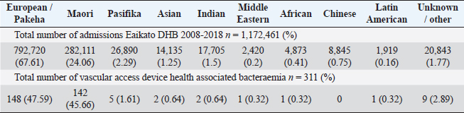 Retrospective study of 311 cases of Staphylococcus aureus bacteremia with vascular access devices compared to ethnicity: Incidence in Waikato New Zealand from 2008-2018
