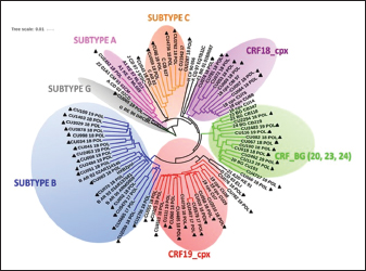 Fig. 2. Phylogenetic tree of the HIV-1 env gene. The analysis included 86 nucleotide sequences, 69 sequenced in the present study and 17 referenced. The evolutionary history was inferred using the maximum likelihood method (PhyML version 3) and the GTR nucleotide substitution model. The inferred consensus tree was used to represent the evolutionary history of the analyzed sequences. The different subtypes are shown in a circular tree with branches indicated in different colors according to the subtype: Blue, subtype B; Orange, subtype C; Green, CRFs_BG (20, 23,24), Red, CRF19_cpx; Violet, CRF18_cpx. The Cuban samples sequenced in this study are marked with a black triangle, the rest are reference sequences of the different subtypes of HIV-1, included in this work. Table 2. Variants of HIV-1 obtained by partial sequencing of two regions of the virus, in the analyzed samples.