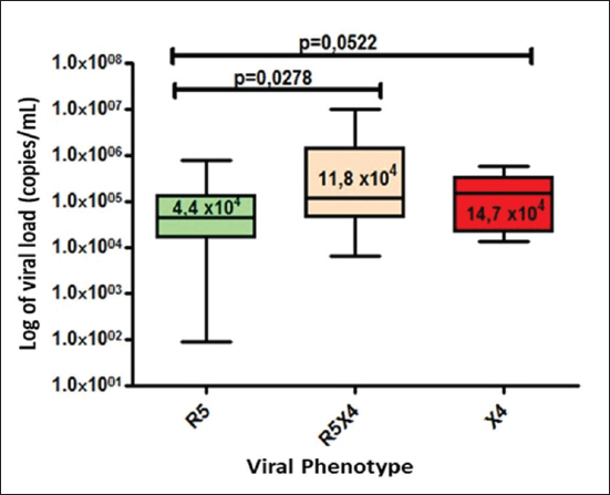 Fig. 3. Median viral load values stratified according to co-receptor use.