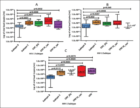 Fig. 4. Comparison of viral load values according to the viral variant detected in the pol gene region (A), in the env gene (B), and in the global subtype (C) of the samples studied.