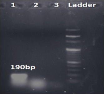 Fig. 1. Amplification of bsmB at 190 bp. Lane 1: PCR product showing amplified bsmB gene. Lane 2: negative control. Table 3. Virulence and antibiotic resistance determinants of the study isolates.