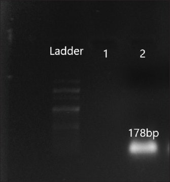Fig. 4. Amplification of aac(6′)II at 178 bp. Lane 2: PCR product showing amplified aac (6′) II gene. Lane 1: negative control. DiscussionFoodborne illnesses account for the most common category of infectious disease according to the surveillance of centers for disease control and prevention (https://www.cdc.gov/foodsafety/outbreaks/index). Several pathogens are associated with foodborne diseases (Campos et al., 2015). Serratia marcescens, considered as one of the foodborne pathogens, is an emergent opportunistic pathogen associated with a wide spectrum of both gastrointestinal and extra-intestinal infections. Many studies reported the occurrence of S. marcescens in food samples (Melo et al., 2018; Khater et al., 2021). The pathogenesis of S. marcescens is attributed to the acquisition of virulence factors such as the production of prodigiosin, motility, production of pore-forming toxin, and resistance determinants (Srinivasan et al., 2017). These armoury of virulence factors help this pathogen to initiate and cause multiple illnesses in humans. Several virulence genes in the S. marcescens isolates have been detected in this study which is in agreement with previous studies by Aggarwal et al. (2017), Stella et al. (2021), Shanks (2013). The presence of such virulent S. marcescens isolates in street food is a threat to public health as such strains can easily disseminate to the gastrointestinal microbiota of humans through contaminated food. Once inside the host, the subsequent lysis of the host cells might help the pathogens to penetrate the tissue and spread in the host organism. Therefore, the identification of such opportunistic pathogens in food is an important global health priority.