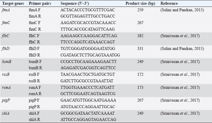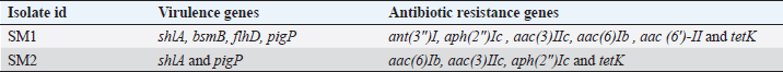 AbstractBackground: Foodborne illness is a global concern and identification of pathogens that cause foodborne disease is a public health priority. Serratia marcescens is an opportunistic pathogen responsible for food poisoning due to its ability to colonize the gastrointestinal surfaces. Serratia marcescens is also responsible for causing a wide range of extraintestinal infections such as pneumonia, urinary tract infection, and keratitis. Aim: The current study investigated the presence of antibiotic-resistant virulent S. marcescens from street food samples. Methods: Two pigmented S. marcescens were recovered from panipuri samples which were then identified using VITEK® GN cards. The virulence genes and the antibiotic resistance genes harbored by the S. marcescens isolates were investigated and further transformation assay was conducted to check the horizontal transferability of the plasmid carrying the antimicrobial resistance genes. Incompatibility typing of the transformants was also assessed and enterobacterial repetitive intergenic consensus polymerase chain reaction was performed to check the heterogeneity of the S. marcescens isolates. Results: Two S. marcescens isolates harboring virulence genes as well as antibiotic resistance genes were detected in this study and it was observed that Inc FIB type plasmid was carrying the resistance genes. Conclusion: The co-existence of both the virulence and antibiotic resistance genes in the two S. marcescens isolates warrants proper surveillance in order to prevent the spread of such pathogenic strains in the environment as well as the community through food samples. Keywords: Virulence genes, Antibiotic resistance, Serratia marcescens, Inc FIB. IntroductionMicrobial contamination of food can lead to severe health complications, leading to death in some cases. According to the World Health Organization, each year about 600 million people suffer from foodborne illnesses causing about 420,000 deaths worldwide (https://www.who.int/news-room/fact-sheets/detail/food-safety). Thus, the identification of foodborne pathogens is a global health priority. Several foodborne bacterial pathogens are involved in food contamination out of which Serratia marcescens is an emerging and less studied foodborne pathogen (Abbas and Hagazy, 2020). Serratia marcescens was considered a nonpathogenic organism until its first known involvement in a nosocomial outbreak in 1951 (Su et al., 2003). It is also considered a foodborne pathogen due to its ability to colonize a wide variety of gastrointestinal surfaces. Once inside the host body, it can penetrate deeper tissues and cause a wide variety of infections such as diarrhea, urinary tract infection, pneumonia, and osteomyelitis (Van Houdt et al., 2007). These pathogens when acquiring the antibiotic resistance determinants further exaggerate the pathogenicity of these pathogens as antibiotic resistance in them leads to serious repercussions for the treatment of any infection. The street foods have a high risk of microbial contamination due to the poor hygiene practice of the street vendors, the use of ungloved hands of vendors to serve food, and most importantly the location of their mobile food vending units as the vending units are usually located near high traffic areas exposing the food to dirt and dust. Food serves as the perfect medium for the proliferation of bacteria and a vehicle for bacterial transmission to consumers and ultimately to the community. Thus, the presence of even a very few number of enteric bacteria with virulence attributes in food poses a public health threat as such pathogens can easily proliferate and transmit to the gastrointestinal tract of consumers through food. The current study identifies two virulent S. marcescens from food samples which were co-harbouring resistance genes, implicating a possible threat to the health of street food consumers. Materials and MethodsBacterial isolatesTwo pigmented S. marcescens isolates were recovered from boiled mashed potato used in serving panipuris (fried puffy balls; a famous street food of India) in January 2022. Thirty-two samples were collected in sterile containers from street vendors selling panipuris in mobile street vending units in and around a town located in the Southern part of Assam, India. The identification of the isolates was accomplished using a VITEK® 2 compact system (Biomerieux, France) using VITEK® GN cards. VirulotypingConventional polymerase chain reaction (PCR) assay was used to target the virulence genes of S. marcescens isolates using nine specific primers as mentioned previously (Salini and Pandian, 2015; Srinivasan et al., 2017) (Table 1). T100TM thermal cycler (Bio-Rad, US) was used to perform PCR assay. PCR was performed using the following reaction conditions; initial denaturation at 95°C for 2 minutes, 34 cycles of 95°C for 1 minute, 50°C for 30 seconds, 72°C for 1 minute, and final extension of 72°C for 5 minutes. Antimicrobial susceptibility profilingThe S. marcescens isolates were subjected to antimicrobial susceptibility testing by disc diffusion test. Antibiotic discs (HiMedia, Mumbai, India) used were ampicillin (30 μg), cefuroxime (30 μg), cefalexin (30 μg), ceftriaxone (30 μg), ceftazidime (30 μg), cefepime (30 μg), cefoxitin (30 μg), cotrimoxazole (25 μg), amikacin (30 μg), gentamicin (10 μg), tigecycline (15 μg), tetracycline (10 μg), imipenem (10 μg), meropenem (10 μg), ciprofloxacin (5 μg), norfloxacin (10 μg), and nalidixic acid (30 μg) and the results were interpreted as per Clinical and Laboratory Standards Institute guidelines (CLSI, 2022). Molecular detection of antimicrobial resistance genesGenes encoding aminoglycoside modifying enzymes (AMEs) and tetracycline resistance were detected by PCR. The genes encoding carbapenemase as well as extended-spectrum β-lactamases (ESBLs), quinolone and sulphonamide resistance genes were also characterized by PCR assay using the previous