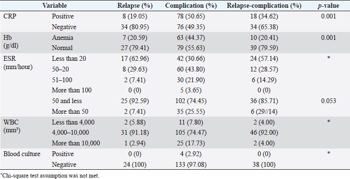 Table 3. Comparison of paraclinical findings in patients with brucellosis in relapse, complication, and relapse-complication groups.